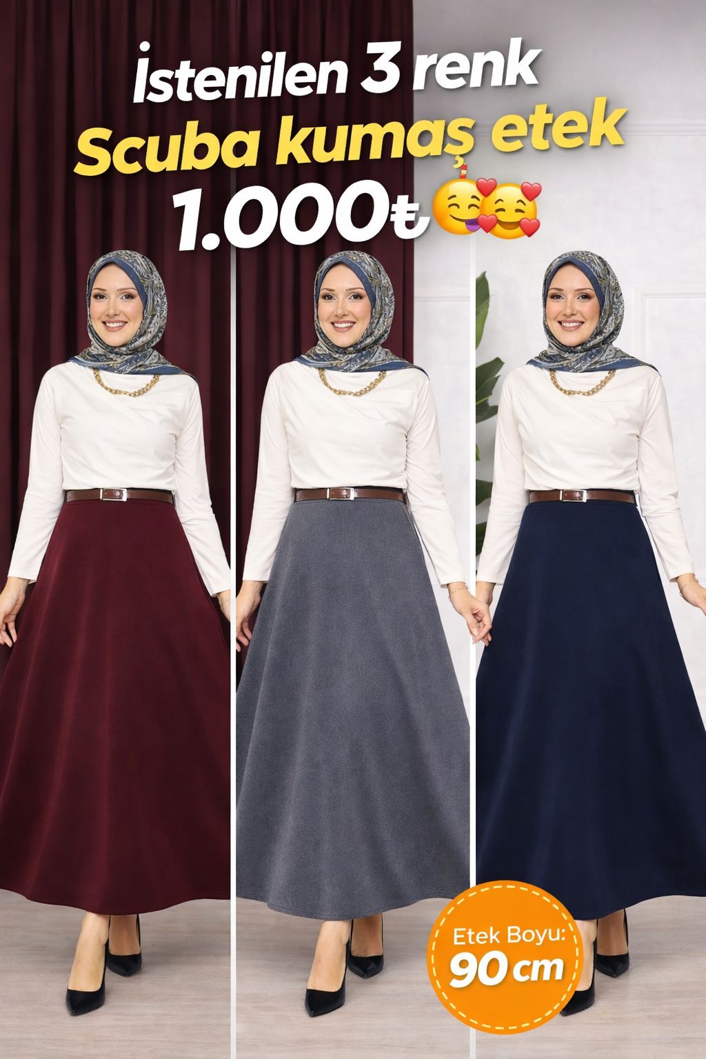 KAMPANYA GÜNLERİ istediğiniz 3 renk scuba kumaş etek sipariş verebilirsiniz sipariş oluştururken notlara yazabilirsiniz veya sipariş numaranızla whatsapptan bize istediğiniz renkleri söyleyebilirsiniz manken üstündeki beden 36 S bedendir
