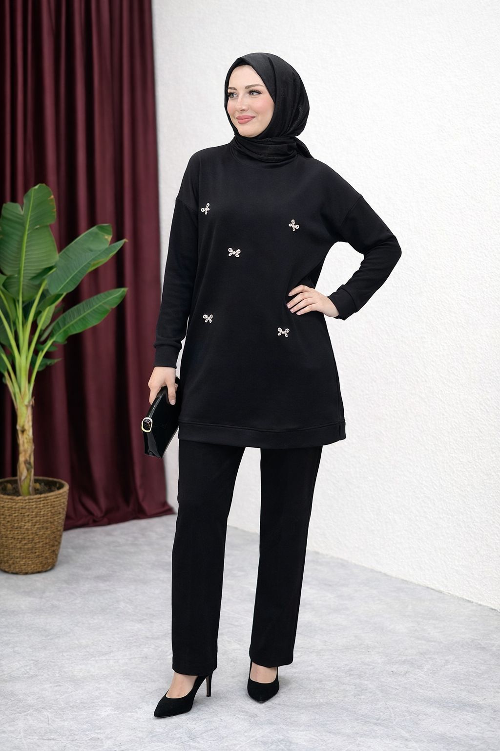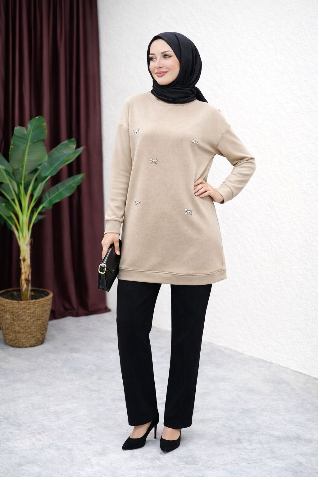 Zarif taş işleme ile bezenmiş bu şık tesettür tunik, şıklığı ve rahatlığı bir arada sunuyor. Hem günlük kullanımda hem de özel anlarda rahatlıkla tercih edilebilecek, modern ve estetik bir tasarımdır. Kaliteli kumaşı ve zarif detaylarıyla her mevsim rahatlıkla kullanılabilir.